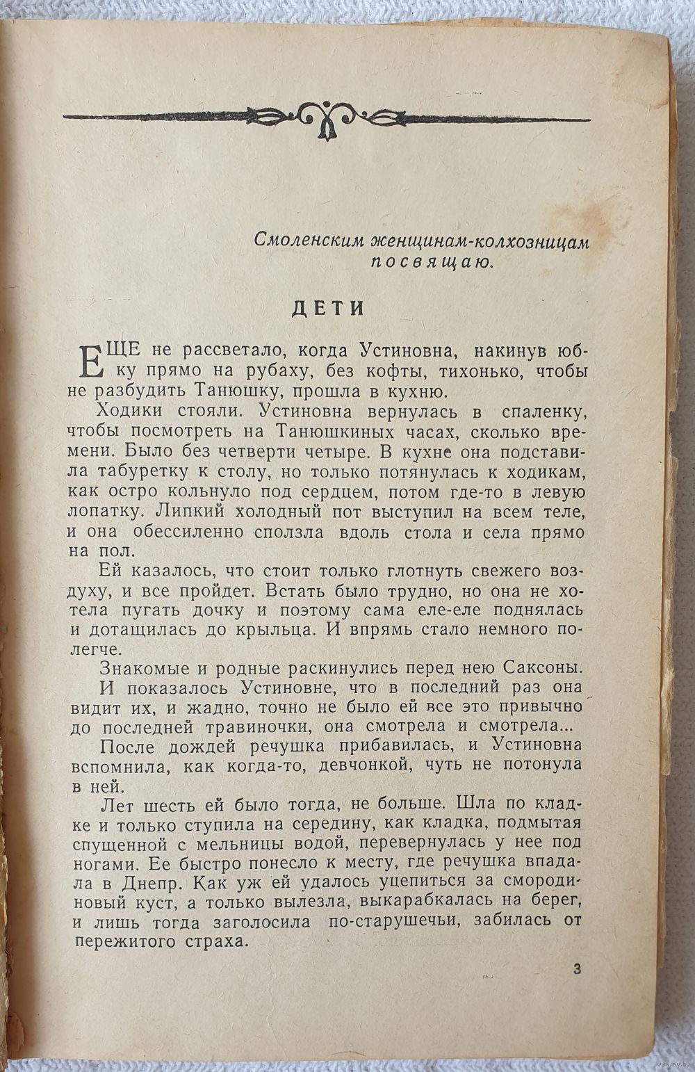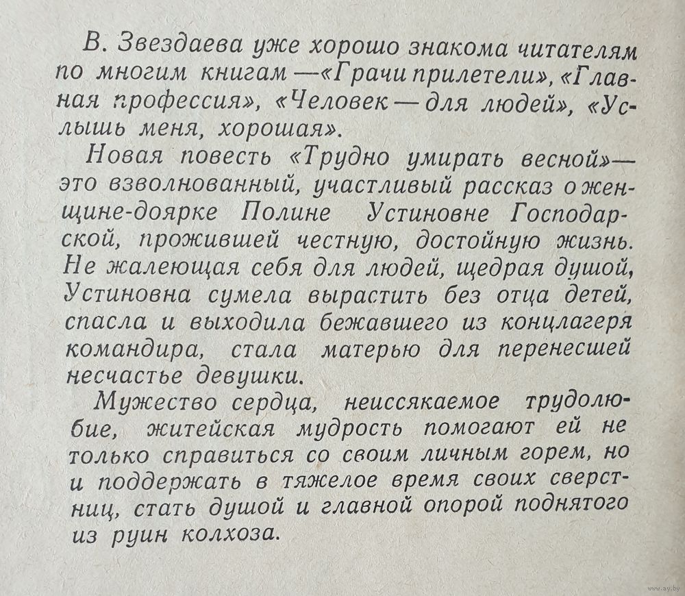 Самые нежные, самые прочувствованные слова не могут выразить и сотой доли того, что заслуживают наши женщины. Они нас кормят, рожают стране солдат и поэтов, ученых и хлеборобов. Они умеют быть мудро терпеливыми и более, чем кто либо, знают самое главное, неизменное в жизни - труд. В них с наибольшей силой проявляется исконно русское великодушие и гостеприимство. Сколь ни трудна их жизнь, сердце их не черствеет, они остаются добрыми, любящими, жизнедеятельными. Образ такой женщины, смоленской колхозницы, и стоит в центре повести "Трудно умирать весной".