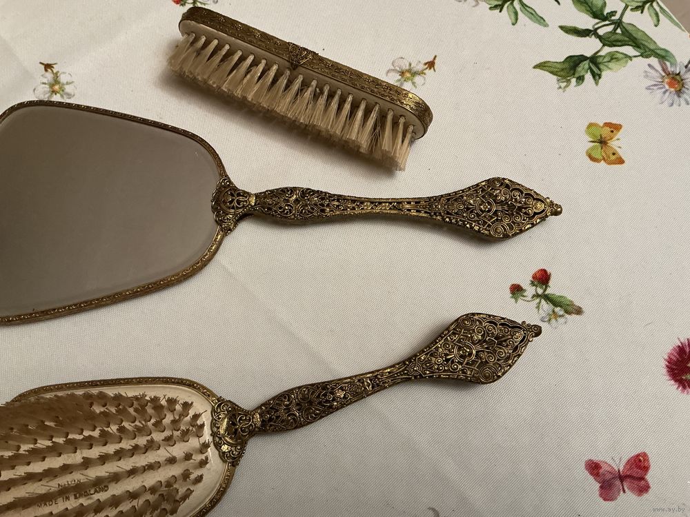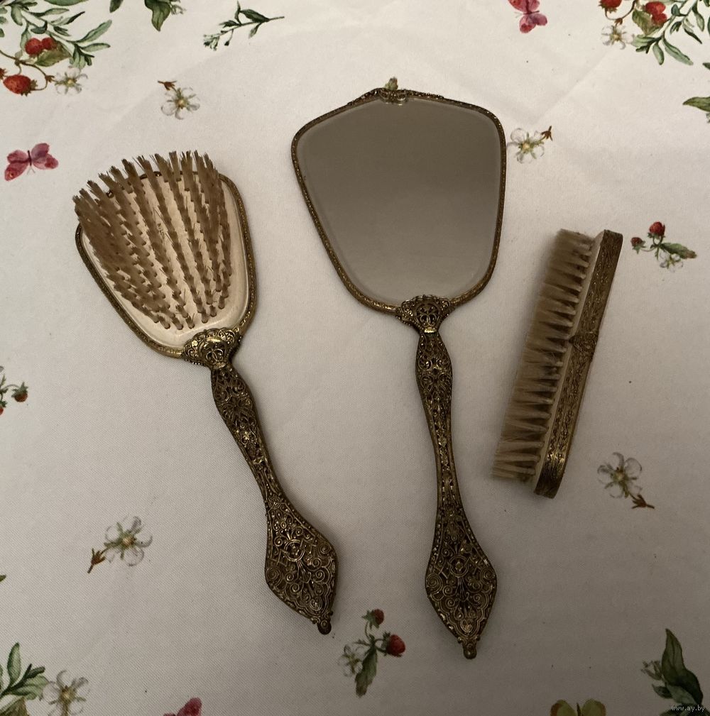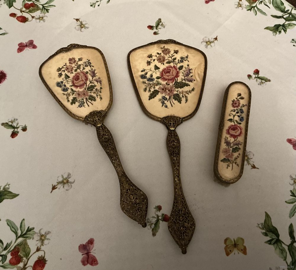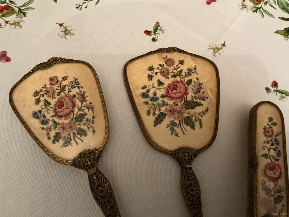 Антикварный набор на туалетный столик , ажурная оправа латунь, вышивка под пластиком , зеркало с фазкой, 33 см х 13 см , пластик можно помыть , расческа 28 см , щетка 16 см , отличный подарок