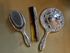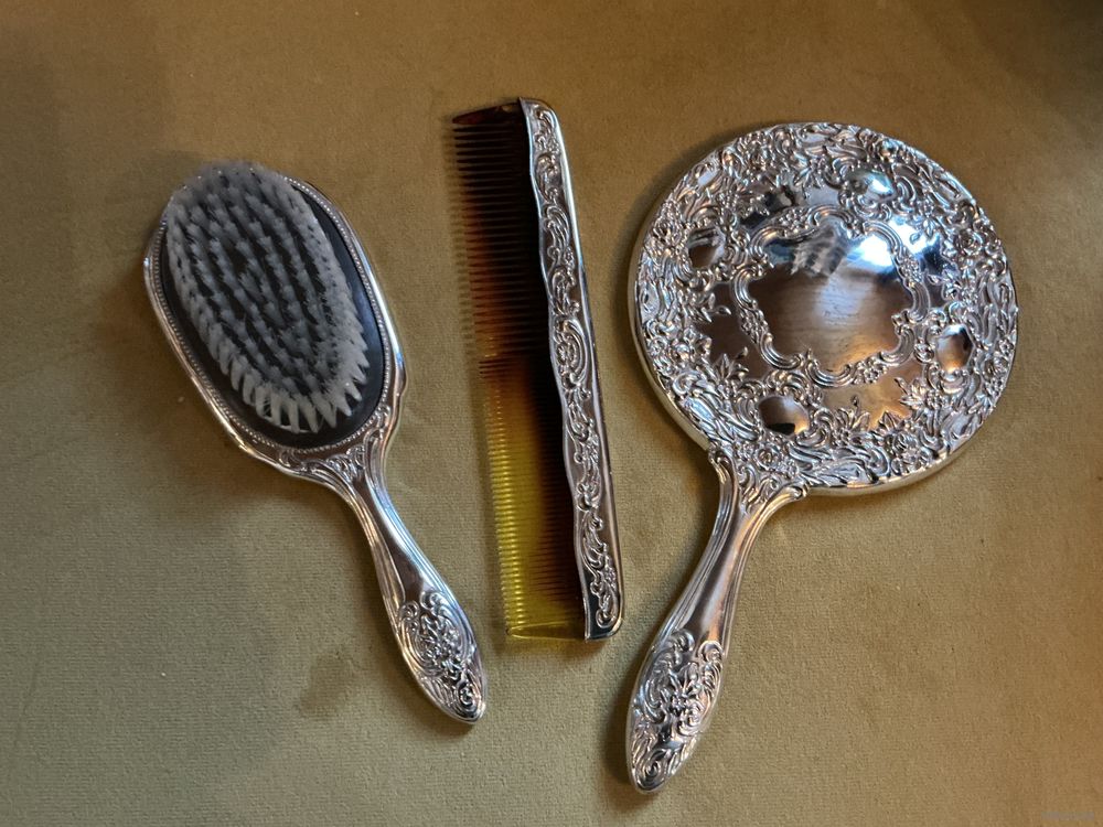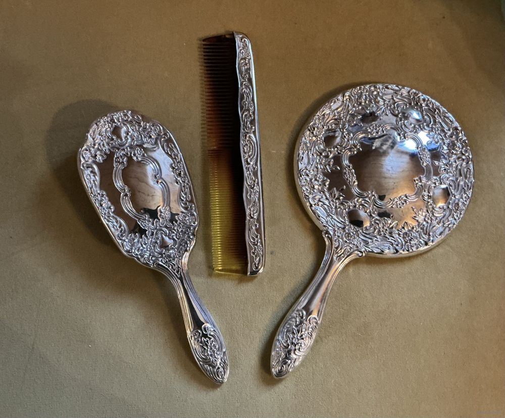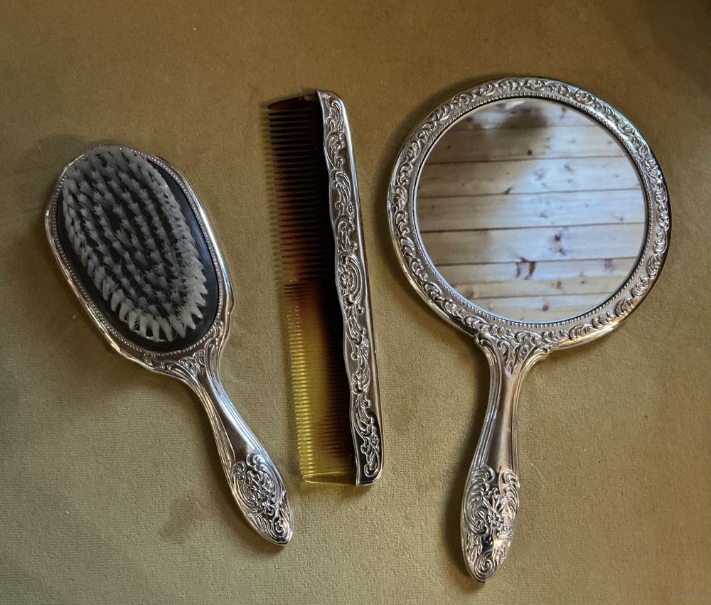 Большой красивый набор на туалетный столик , зеркало большое длина 24 см , ширина 14 см , зеркало без дефектов, щетка длина 20 см , расческа 19 см , серебрение , хорошее состояние, металл довольно тяжелый, отличный подарок , смотрится как Серебро