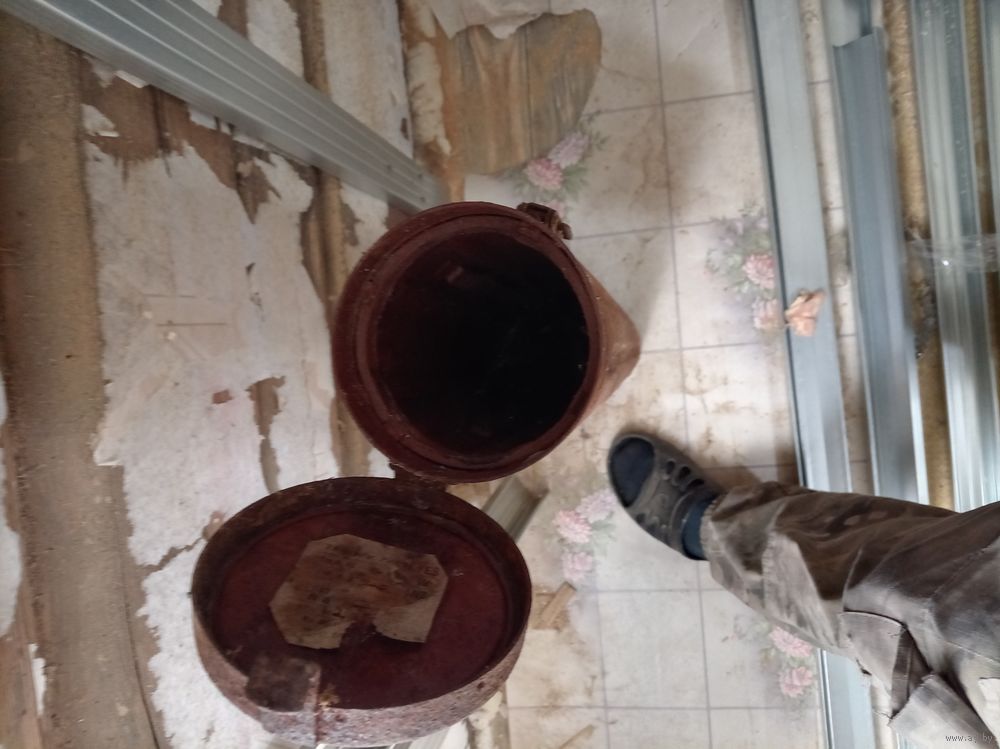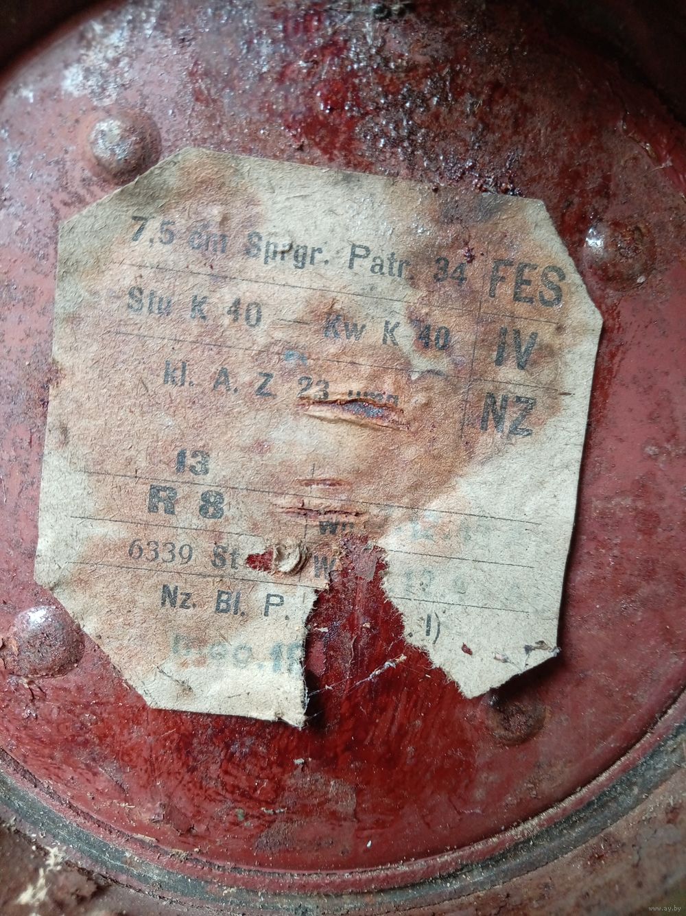 Лежал на чердаке, на бирке просматривается штамп 12 . 43.,дыр нет, внутри сохранилась краска.