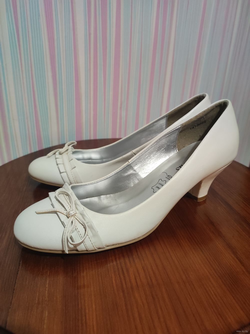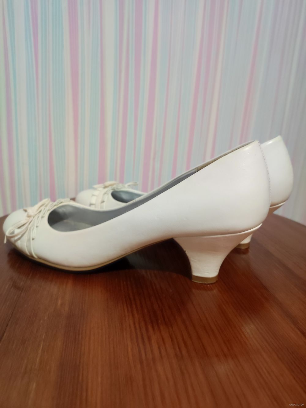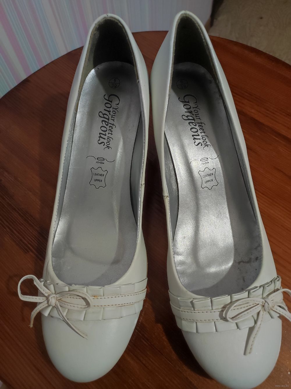 Белые кожаные туфли New Look на среднем каблучке, на ножку 38 размера (длина по стельке 25 см). Высота каблука 5,5 см. Нат. кожа, сделаны в CAMBODIA.