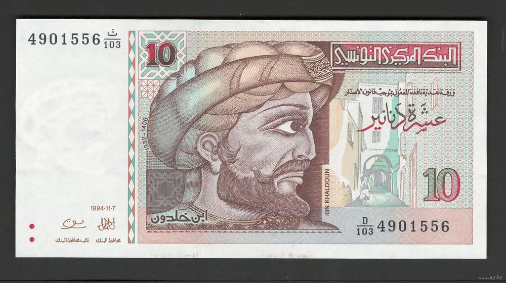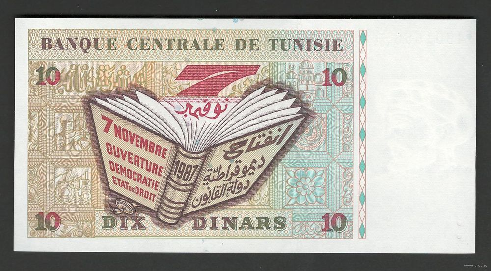 Тунис 10 динар 1994 года. Тип P-87А. Коричневая. Состояние UNC