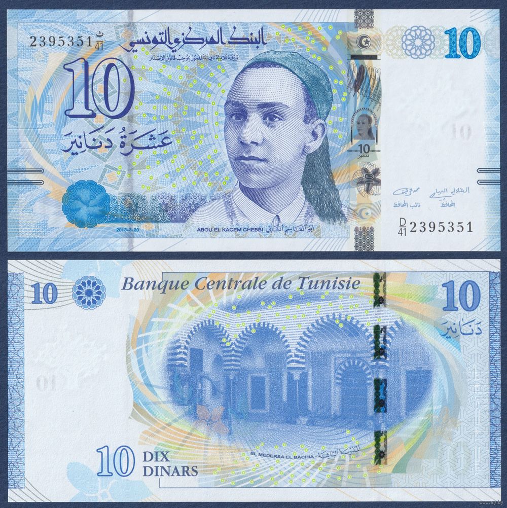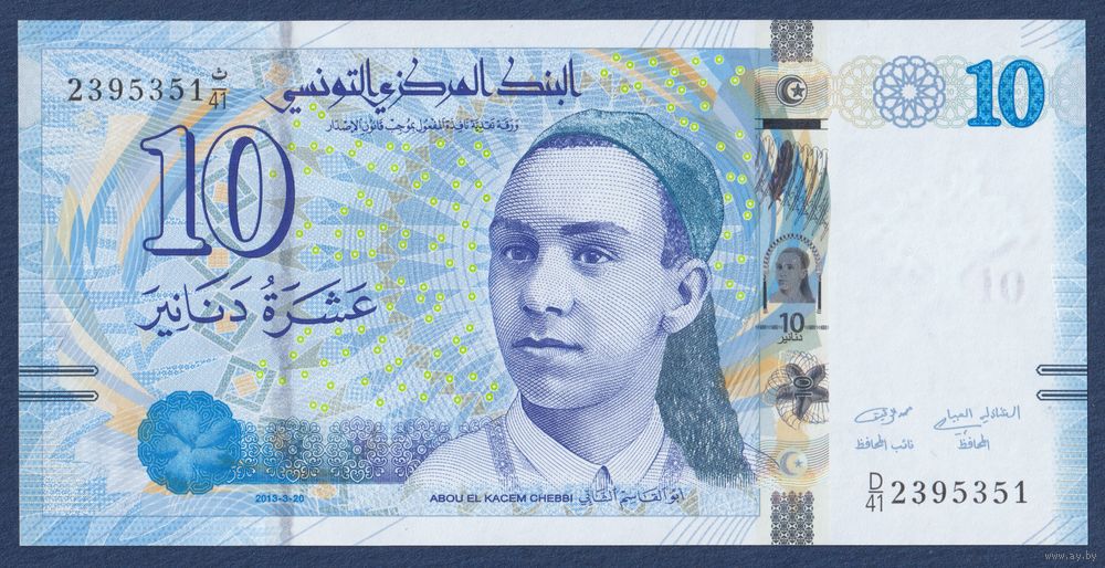Тунис, 10 динаров 2013 г, P-96 (D, поэт Абуль-Касим аш-Шабби), UNC