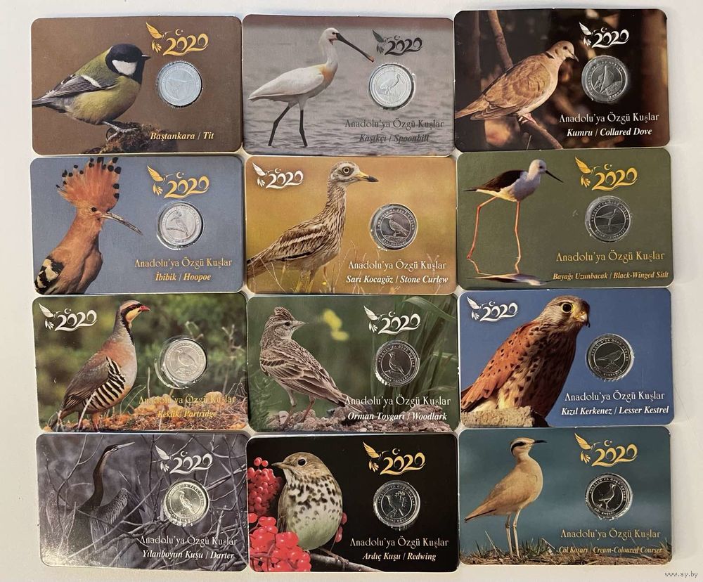Турция 1 куруш 2020 Анталийские птицы набор 12 монет тираж 5000 шт UNC в блистерах