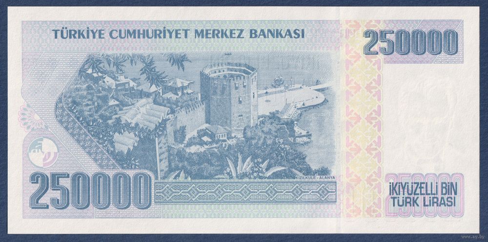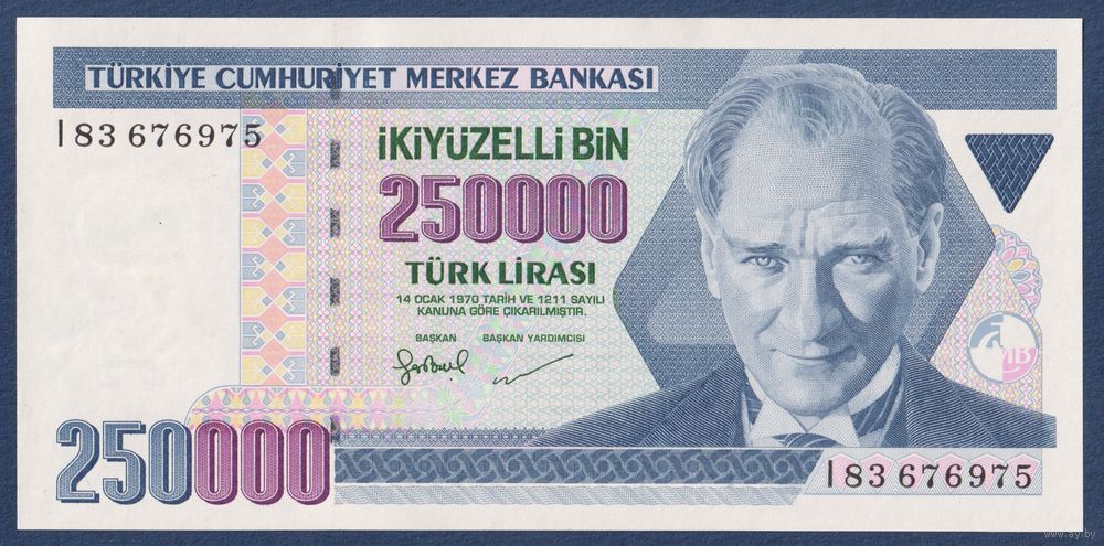 Турция, 250000 лир 1970 г, P-211 (I, президент Мустафа Кемаль Ататюрк, Красная башня в Анталии), UNC