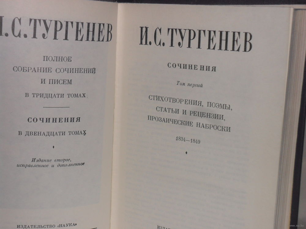 Содержание: Том 1 - Стихотворения, поэмы, статьи и рецензии, прозаические наброски 1834-1849. Том 2 - Сцены и комедии 1843-1852. Том 3 - Записки охотника 1847-1874. Том 4 - Повести и рассказы. Статьи и рецензии 1844-1854. Том 5 - Рудин, статьи и воспоминания 1855-1859. Том 6 - Дворянское гнездо. Накануне. Первая любовь. 1858-1860. Том 7 - Отцы и дети. Повести и рассказы. Дым. 1861-1867. Том 8 - Повести и рассказы 1868-1872. Том 9 - Повести и рассказы 1874-1877. Новь 1876. Том 10 - Повести и рассказы 1881-1883. Стихотворения в прозе 1878-1883. Произведения разных городов. Том 11 - Литературные и житейские воспоминания. Биографические очерки и некрологи. Автобиографические материалы. Незавершенные замыслы и наброски 1852-1883. Том 12 - Либретто комических опер. Водевиль. Стихотворения. Речи. Записки общественного назначения. Автобиографические незавершенные Dubia 1840-1883. Указатели.