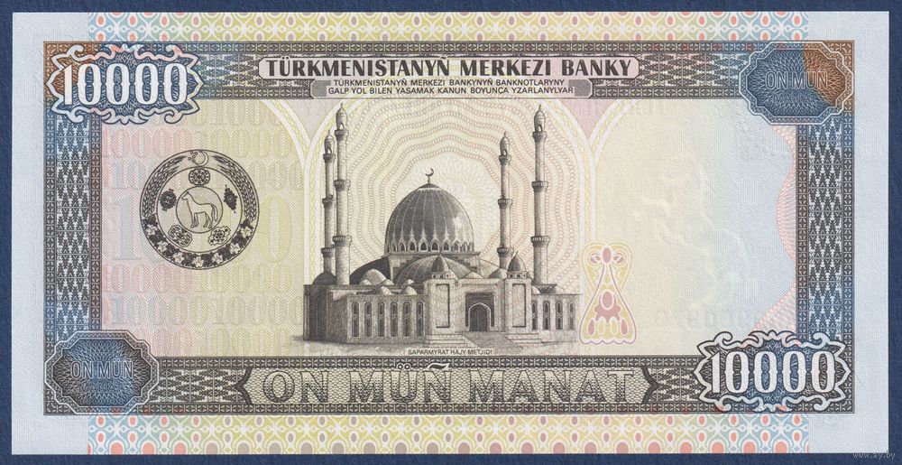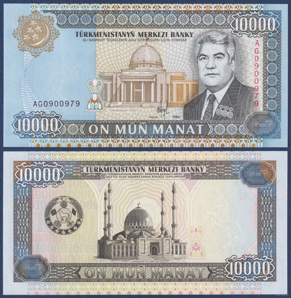 Туркменистан, 10000 манат 1999 г, P-13(2) (AG, президент Сапармурат Ниязов, мечеть Сапармурата Хаджи), UNC