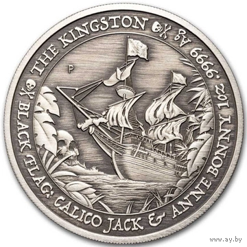 На реверсе изображен корабль "The Kingston" на фоне пиратского флота, видны паруса и характерные детали корабля. На реверсе также имеются надписи: THE "KINGSTON", "BLACK FLAG: "CALICO JACK & ANNIE BONNY" и информация о весе и чистоте драгоценного металла. Кроме того, виден знак монетного двора The Perth Mint в виде буквы "P".