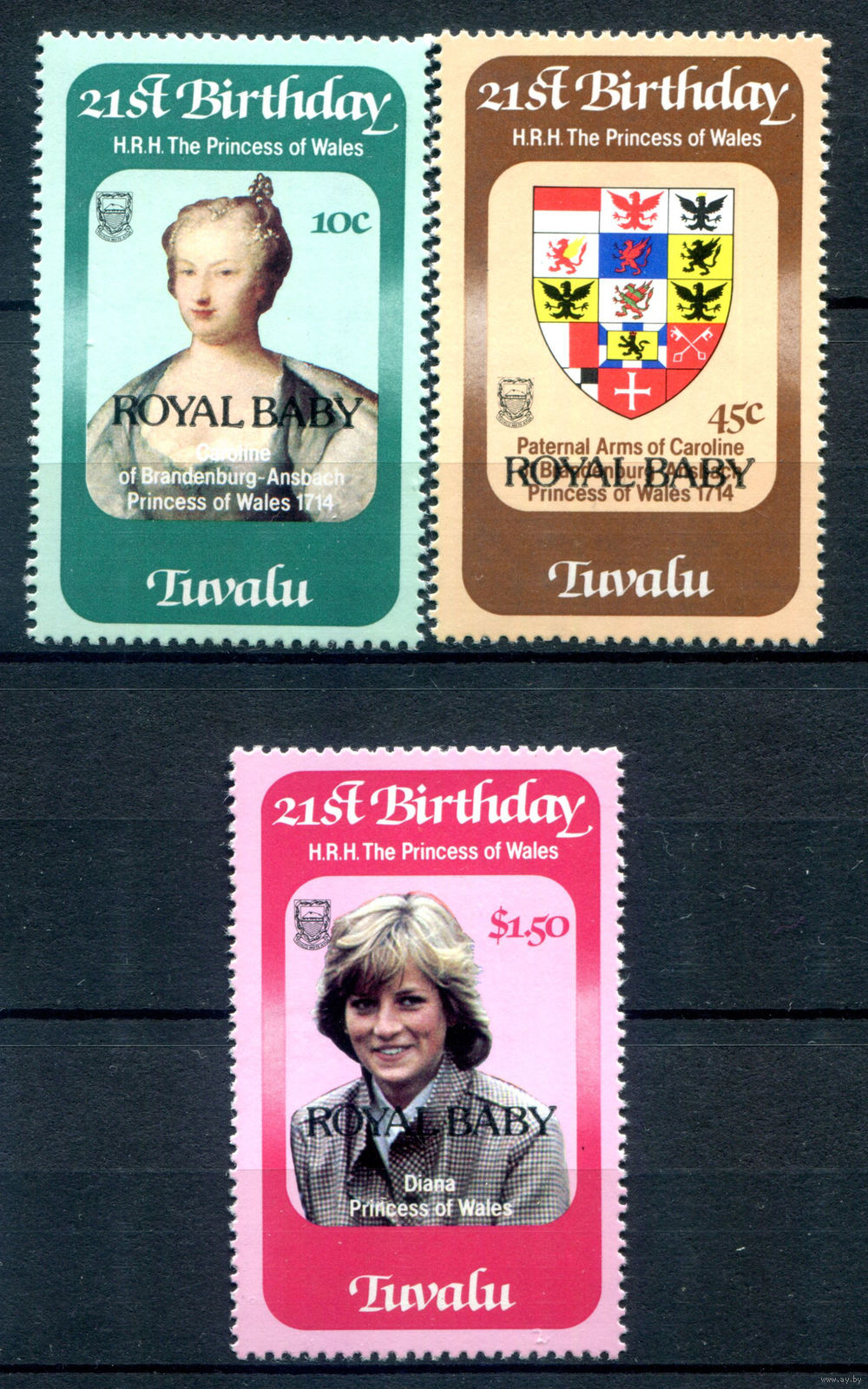 Тувалу - 1982г. - День Рождения принцессы Дианы, герб, рождение принца Уильяма - 3 марки - полная серия, MNH, 2 марки с небольшим повреждением клея [Mi 163-165]. #3-WB-77-B-2