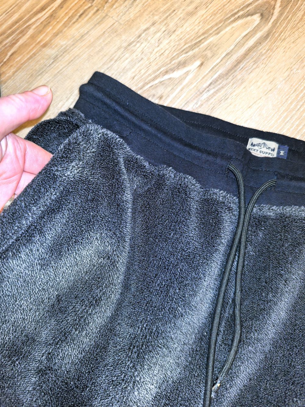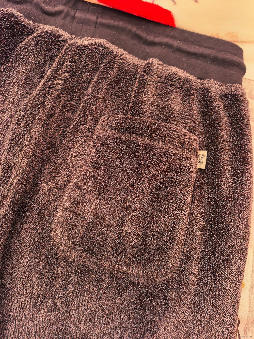Очень густой плюш (флис), мягкие, тёплые, в них даже в мороз на улице не холодно) Цвет очень-очень тёмно серый.