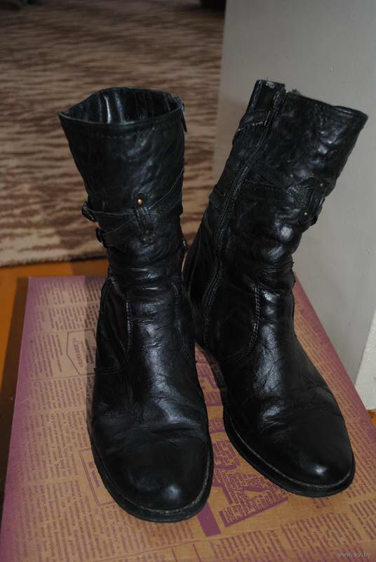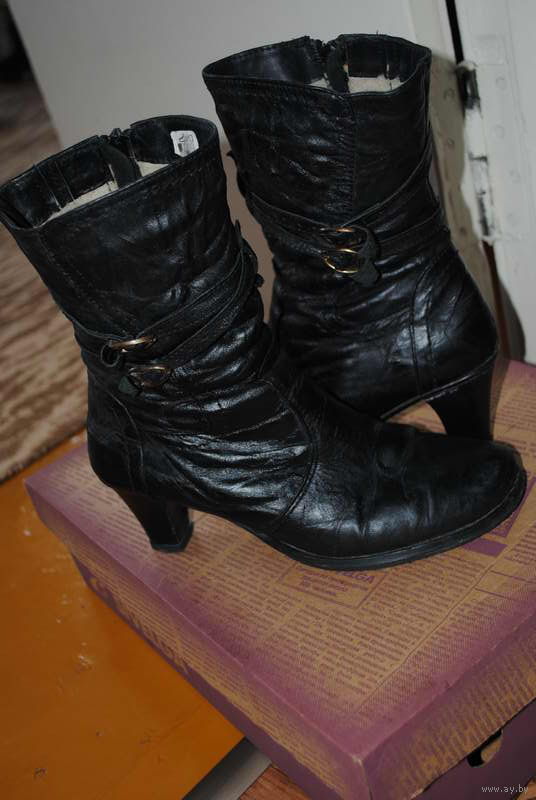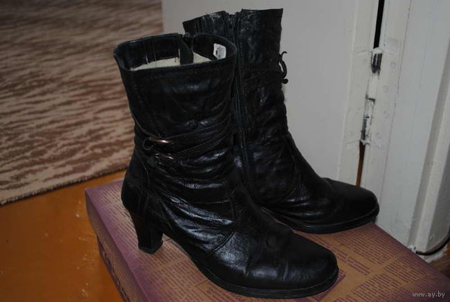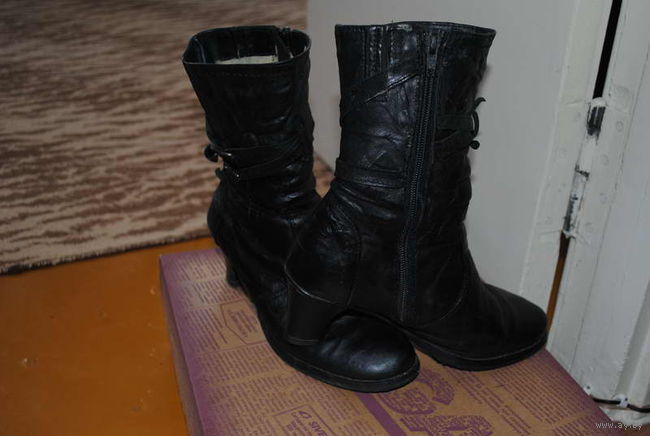 Тёплые женские_САПОГИ_(Чёрн.жатая-мат.кожа)_Зимние_Б.У._100%_нат.кожа/кожаные_(нат.мех.)_гос.Польша_реально сойдут на_37/37,5-38_размер_на узкую или на средней полноты ножку!