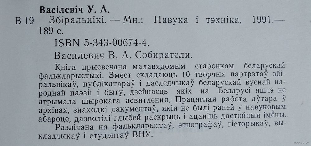 У. А. Васілевіч. Збіральнікі: 10 творчых партрэтаў збіральнікаў, публікатараў і даследчыкаў беларускай вуснай народнай паэзіі і быту. Мінск : Навука і тэхніка, 1991 г. 187 с. Цверды пераплет.