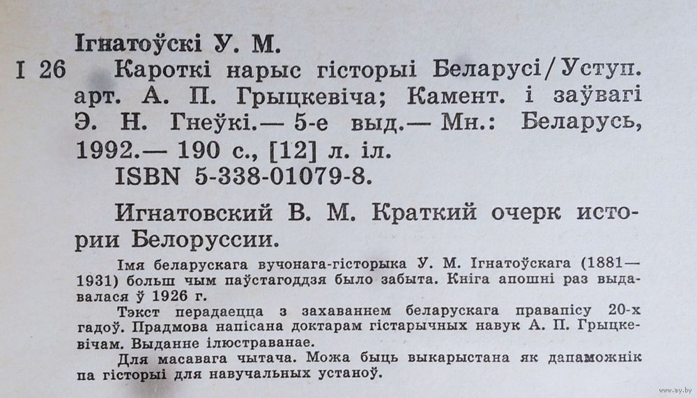 У. М. Ігнатоўскі. Кароткі нарыс гісторыі Беларусі. 5-е выд. Мінск : Беларусь, 1992 г. 188 с.Цверды пераплет.
