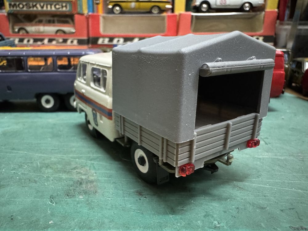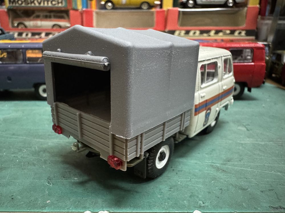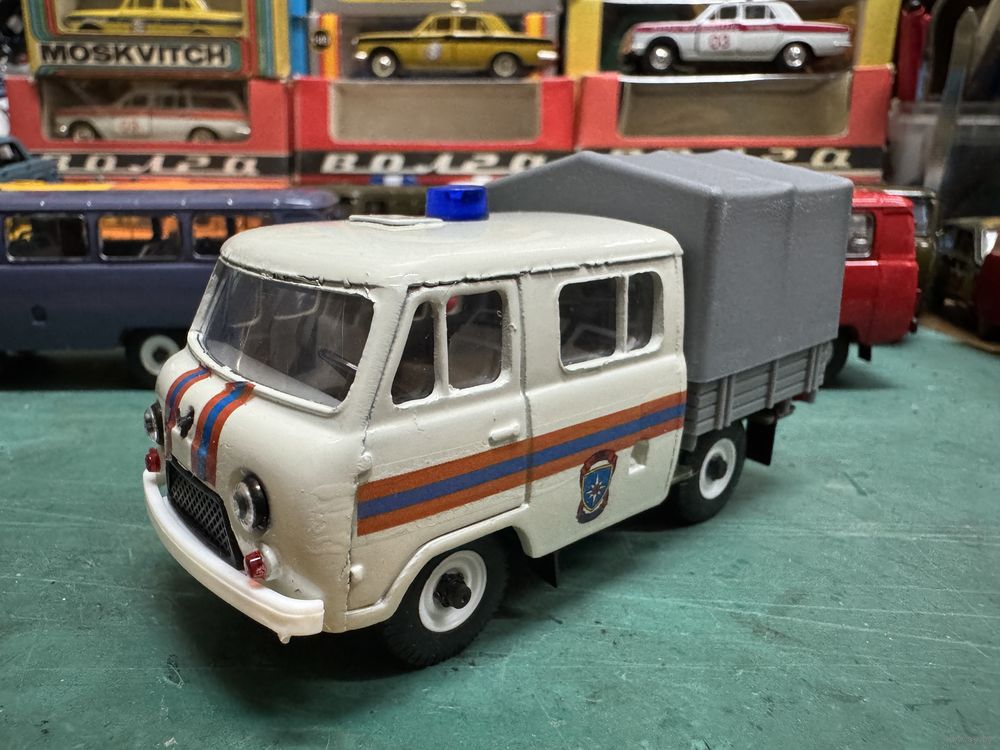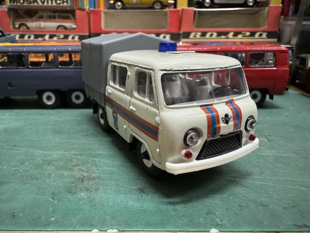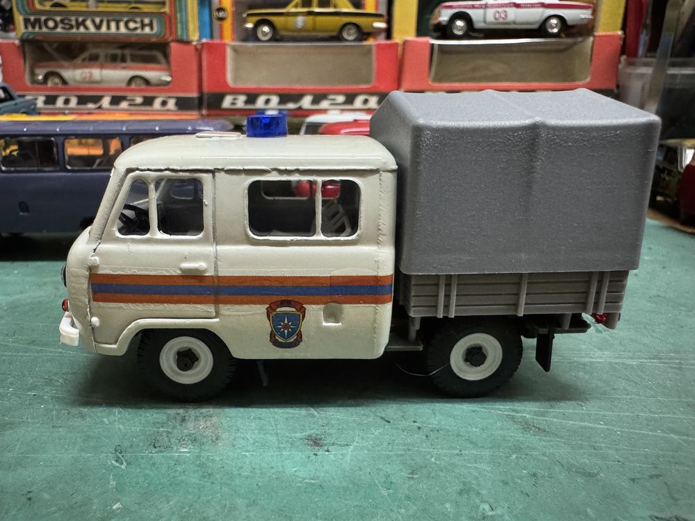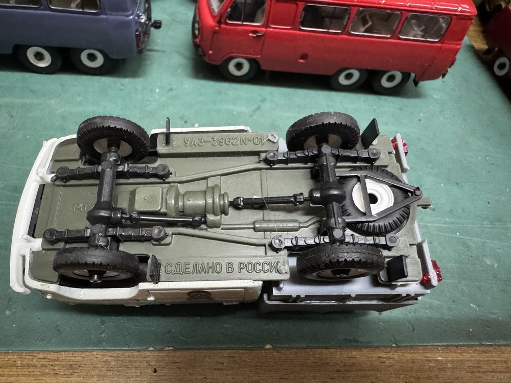 УАЗ-39094 Фермер, МЧС пожарный, кабина металл, кузов с тентом. Дно с надписью УАЗ-3962 №01 ставилось универсально почти на всех поздних выпусках УАЗов. Оригинальные заводские декали по лаком.