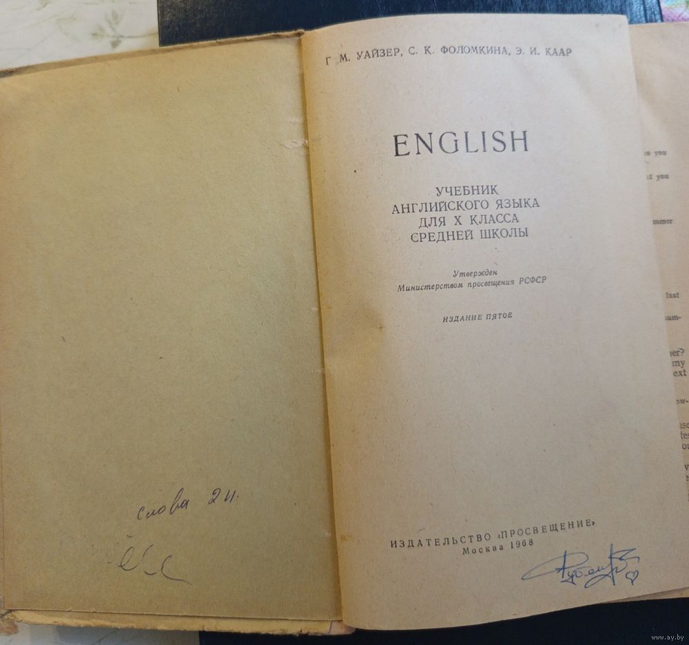Учебник английского языка для 10 класса, издательство Просвещение, 1968 года. Состояние приемлемое.