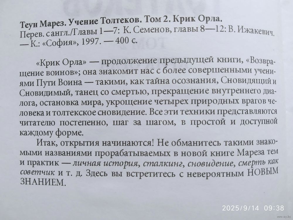 Книга 1. Возвращение воинов. В первой книге Мареза представлены четыре мощные практические техники, а именно: работа с эмоциями и намерением, перепросмотр, сталкинг и не-делание. Книга 2. Крик орла. Крик Орла - продолжение предыдущей книги, Возвращение воинов, она знакомит нас с более совершенными учениями Пути Воина - такими, как тайна осознания, Сновидящий и Сновидимый, танец со смертью, прекращение внутреннего диалога, остановка мира, укрощение четырех природных врагов человека и толтекское сновидение. Все эти техники представляются читателю постепенно, шаг за шагом, в простой и доступной каждому форме. Итак, открытия начинаются! Не обманитесь такими знакомыми названиями прорабатываемых в новой книге Мареза тем и практик - личная история, сталкинг, сновидение, смерть как советчик и т.д. Здесь вы встретитесь с невероятным новым значением.