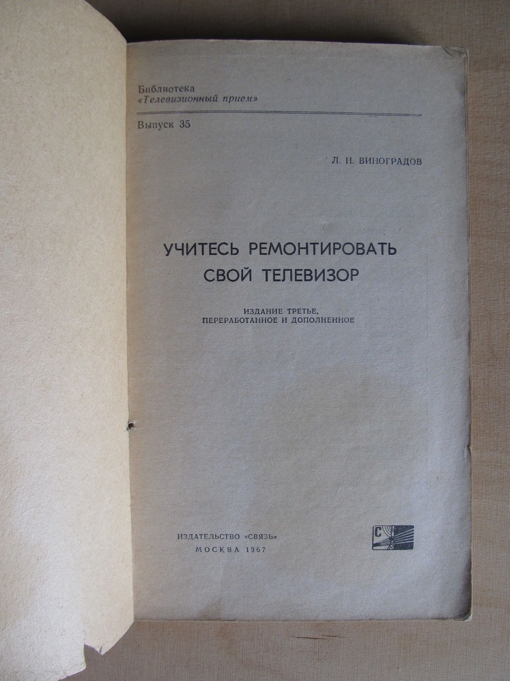 Серия: Библиотека "Телевизионный прием". Вып. 35. М. Связь 1967 г. В книге приведено большое количество иллюстраций внешнего вида деталей, радиоламп, полупроводниковых диодов, схем расположения их в телевизорах, приемов ремонта. Это позволяет владельцу телевизора, не знакомому с внешним видом установленных в телевизоре деталей и радиоламп, отыскать их в телевизоре и при необходимости отремонтировать или заменить новыми.