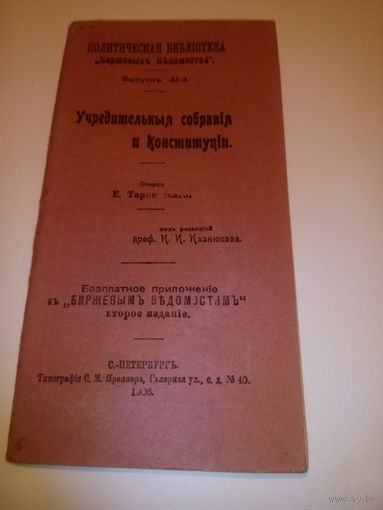 Политическая Библиотека 'Биржевыхъ Ведомостей'.Выпускъ 41-й. Очеркъ Е.Тарновскаго. подъ редакцией проф. И.И.Иванюкова. 63 стр., размер 8.5х17.5 см