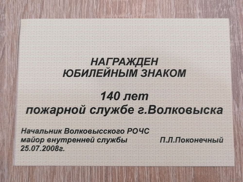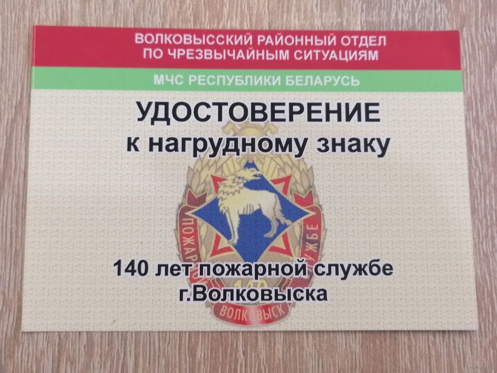 Удостоверение 140 лет пожарной охране г. Волковыска