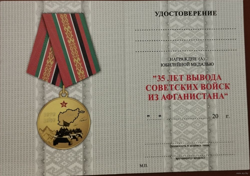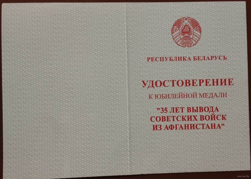 Удостоверение 35 лет вывода советских войск из Афганистана