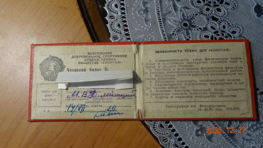 Удостоверение члена ДСО СПАРТАК 1962 г