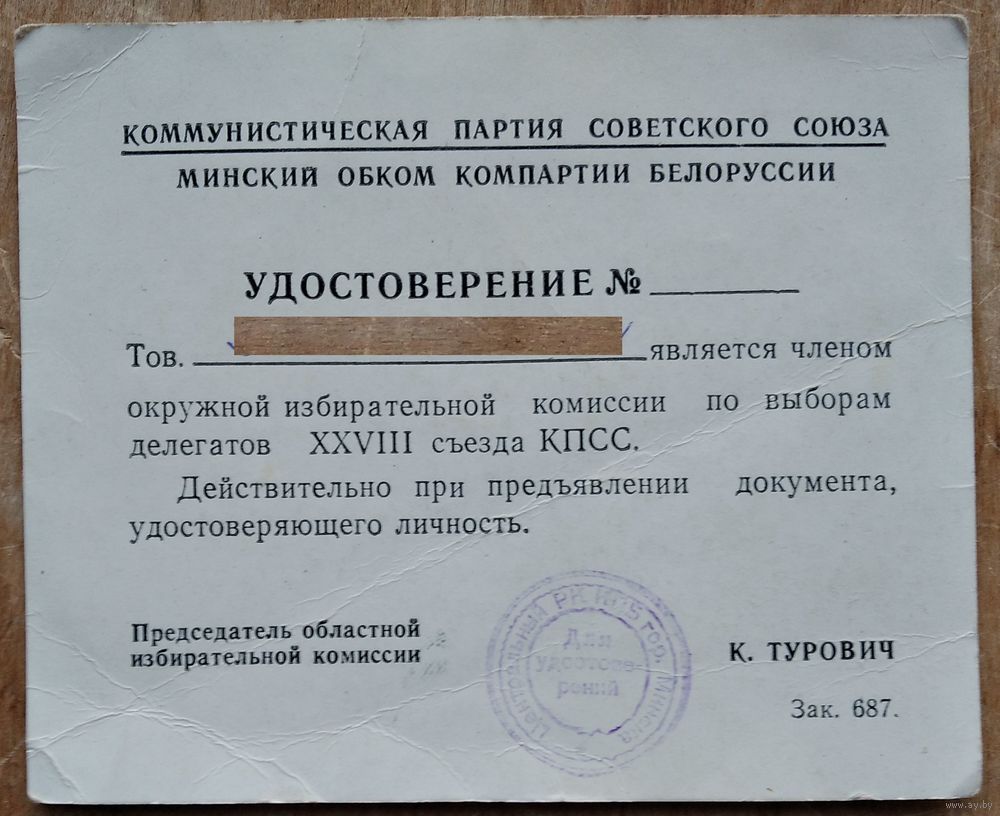 Удостоверение члена комиссии по выборам делегатов XXVIII съезда КПСС. 1990 г.