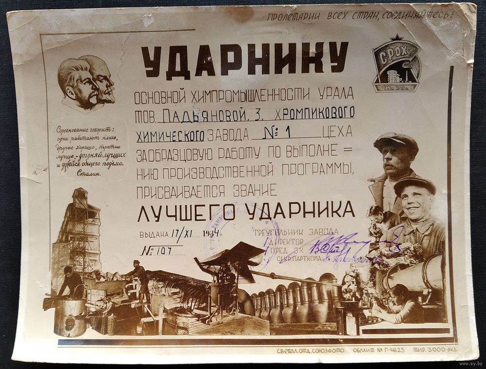 Удостоверение-грамота к знаку "СРОХ. Союз рабочих основной химической промышленности". 1934 г.