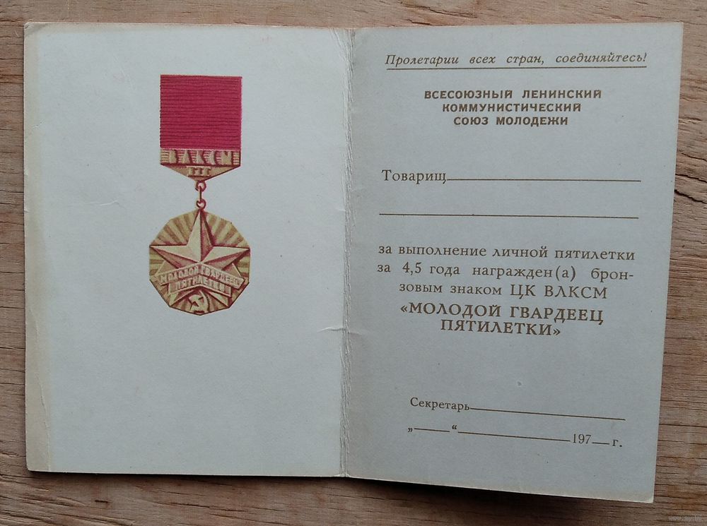 Удостоверение к бронзовому знаку ЦК ВЛКСМ " Молодой гвардеец пятилетки ". Чистое.