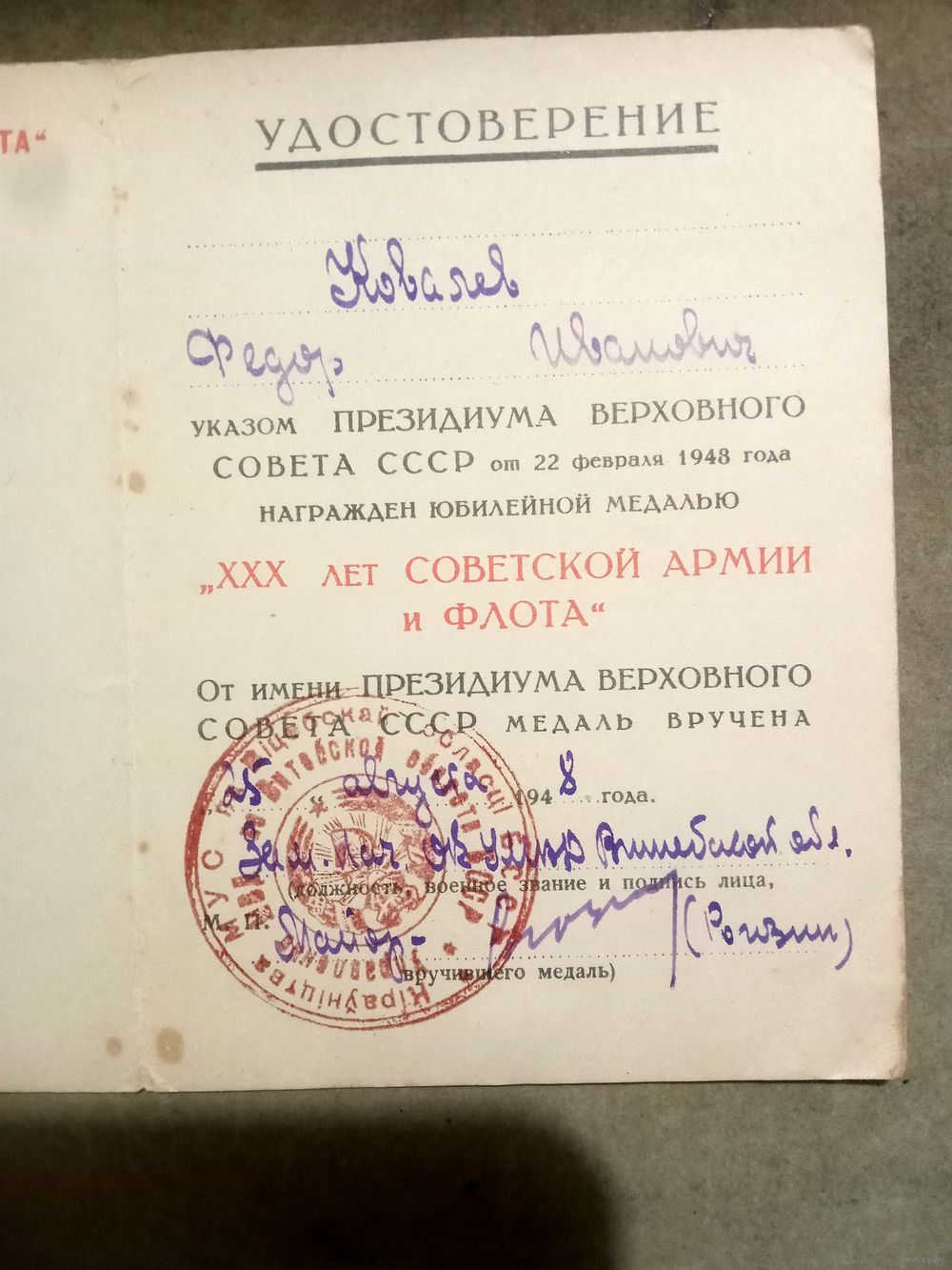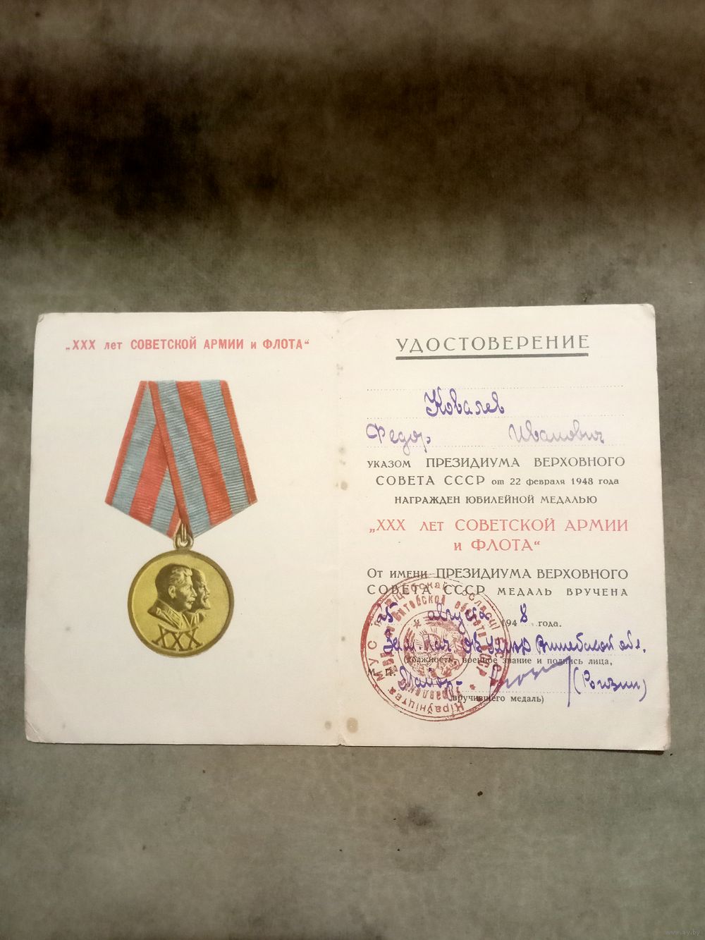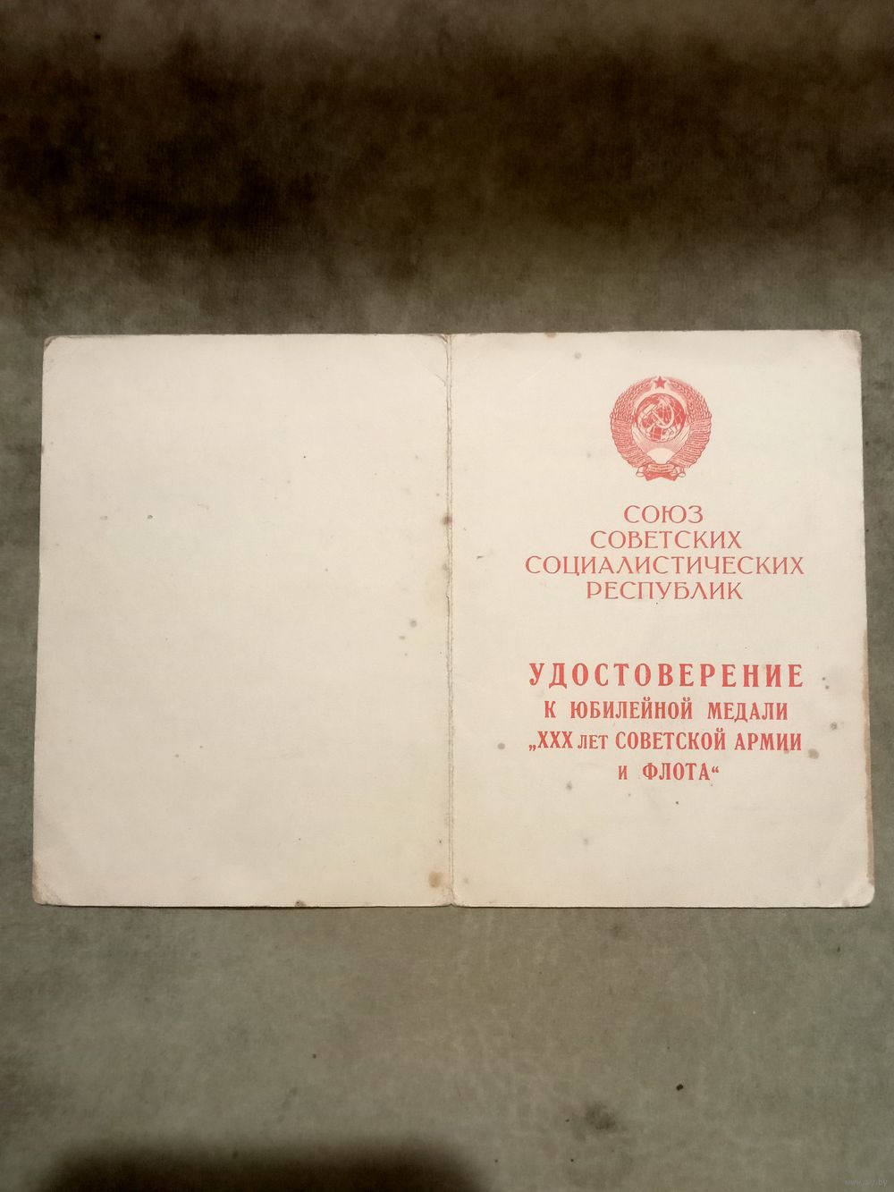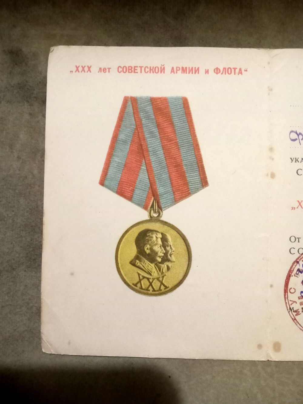 Удостоверение к медали. 30 лет советской армии и флота. # 1.