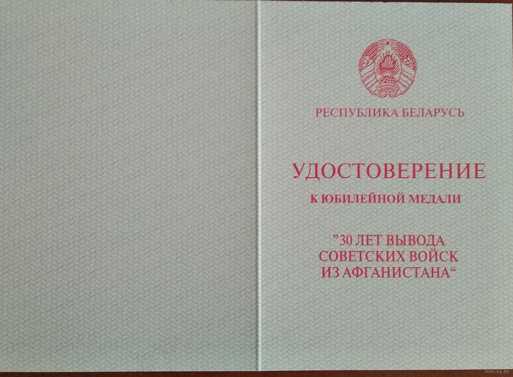 Удостоверение к медали "30 лет вывода войск из Афганистана"