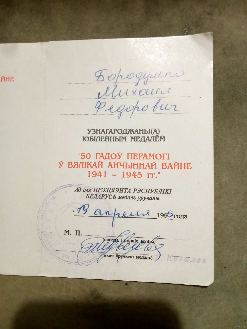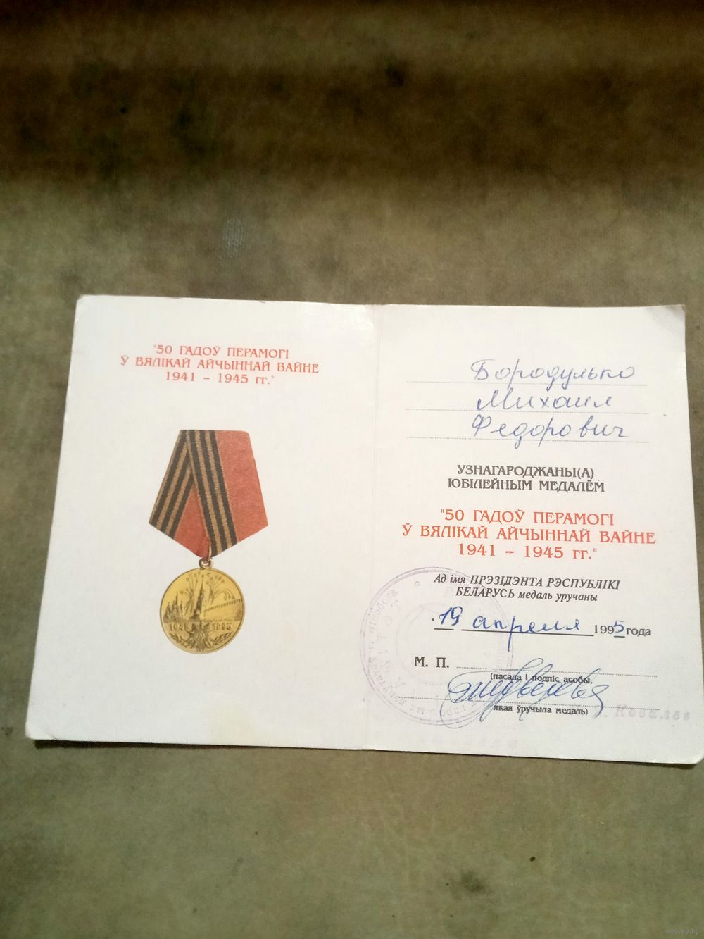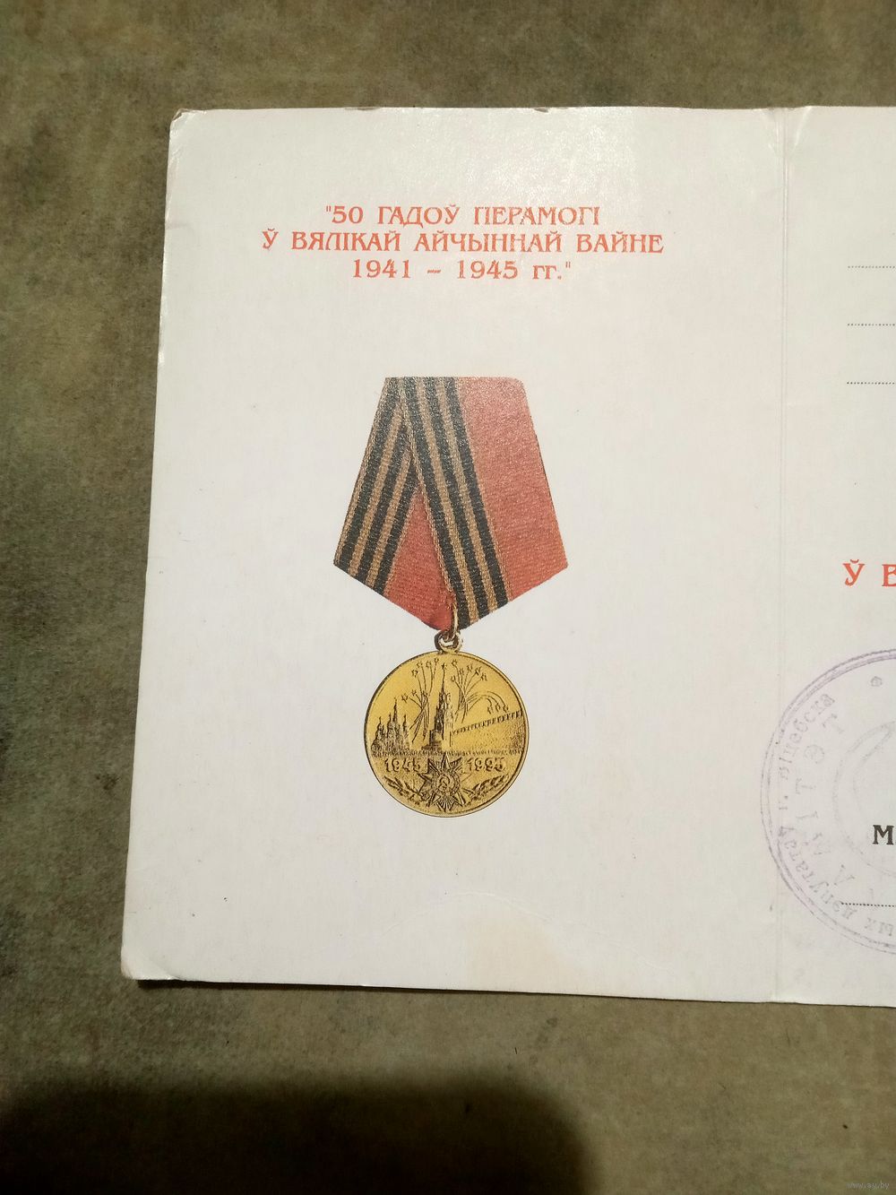 Удостоверение к медали. 50 лет победы в великой отечественной войне. # 1.
