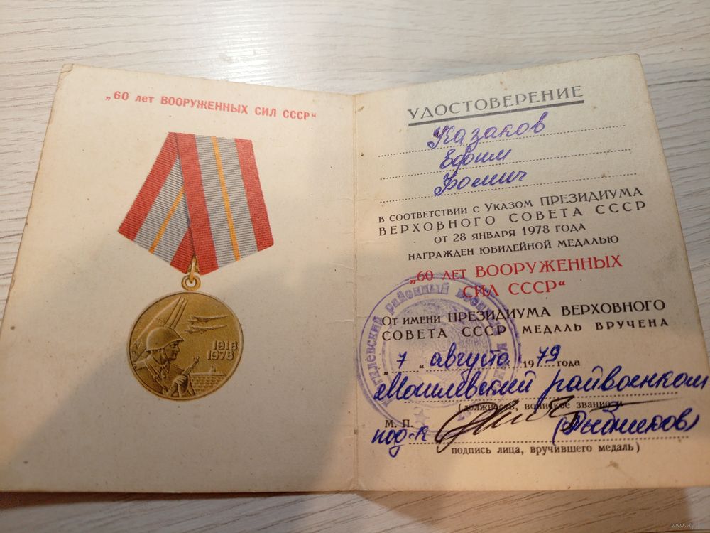 Удостоверение к медали. 60 лет Вооруженных сил СССР.\2
