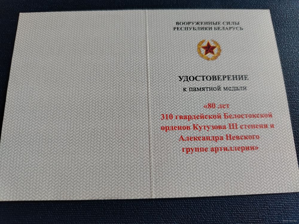 Удостоверение к медали "80 лет 310 гвардейской Белостокской орденов Кутузова 3 ст. и Александра Невского группе артиллерии" ВС