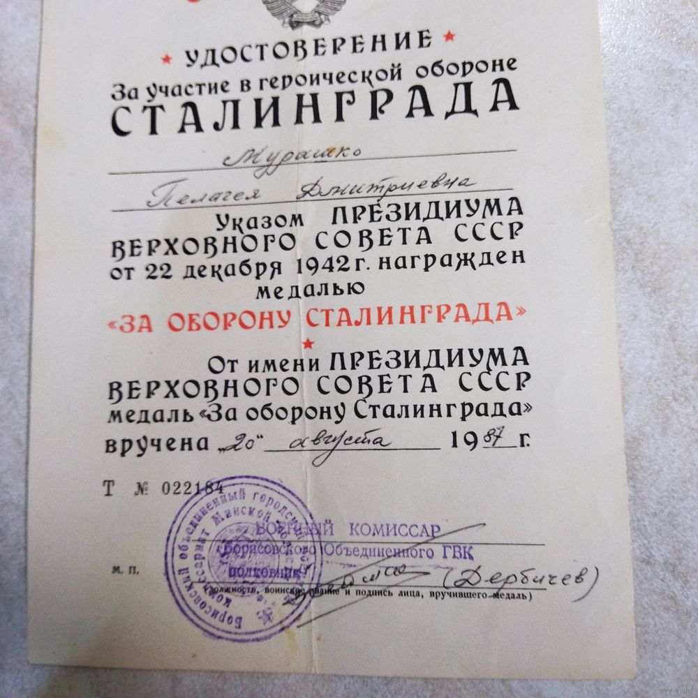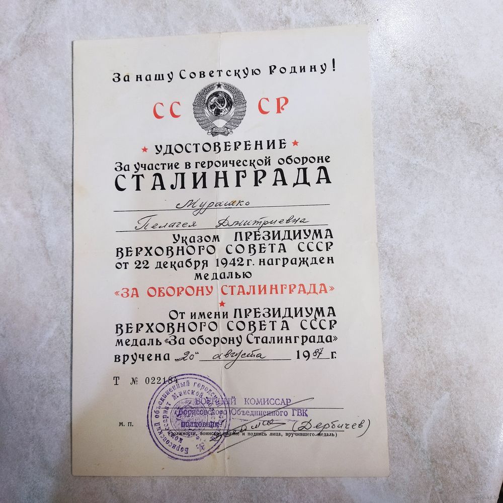 Удостоверение к медали. На женщину. За оборону Сталинграда. Военкомат. Поздний СССР. 1987 год.