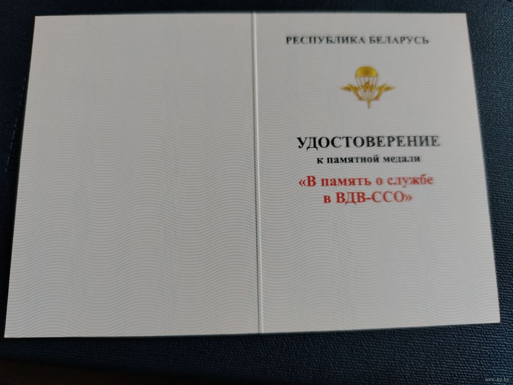 Удостоверение к медали "В память о службе в ВДВ-ССО" разновидность медали 1