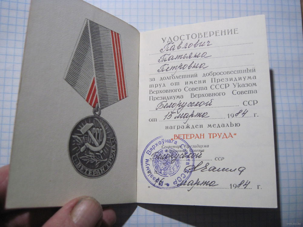 Удостоверение к медали "Ветеран труда" 1984 г. с рубля!