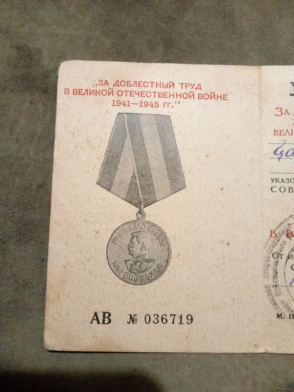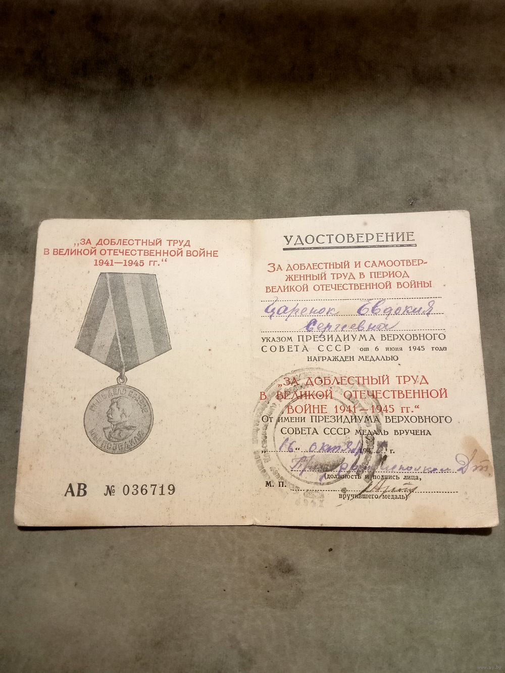 Удостоверение к медали. За доблестный труд в Великой отечественной войне.