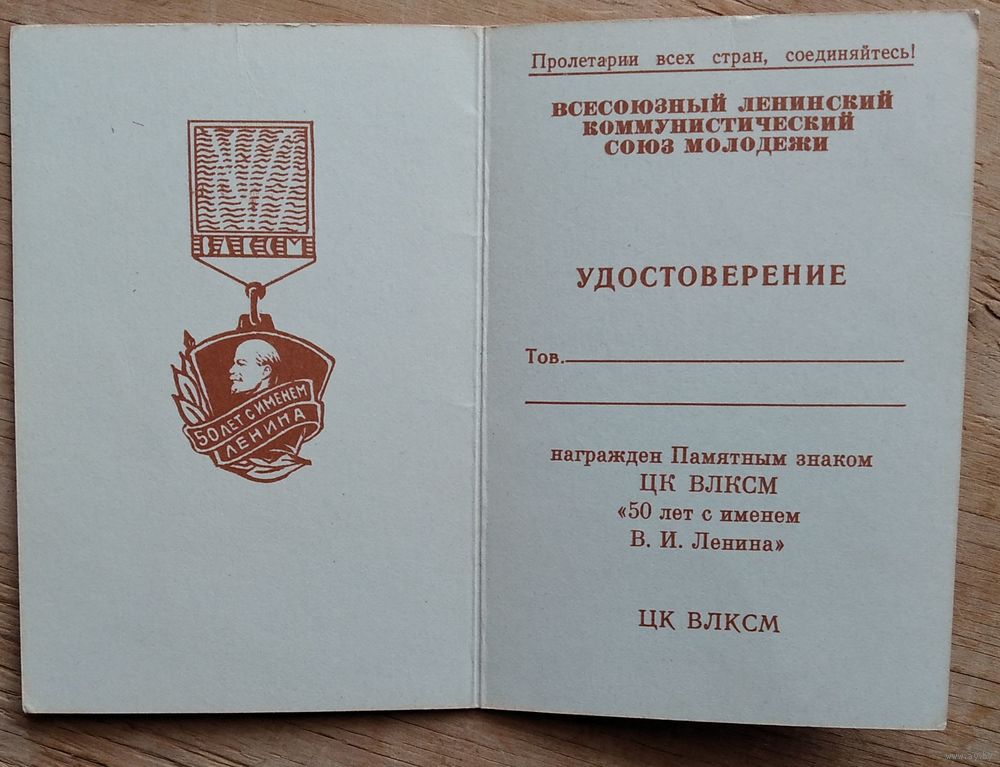 Удостоверение к памятному знаку ЦК ВЛКСМ " 50 лет с именем В.И. Ленина ". 1974 г.