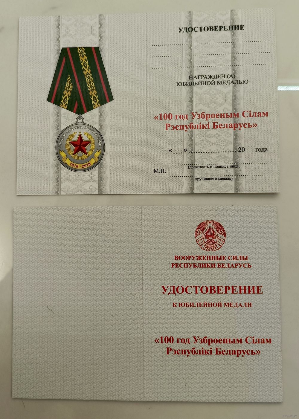 Удостоверение к юбилейной медали 100 лет вооруженным силам Республики Беларуси (оригинал из плотного материала)