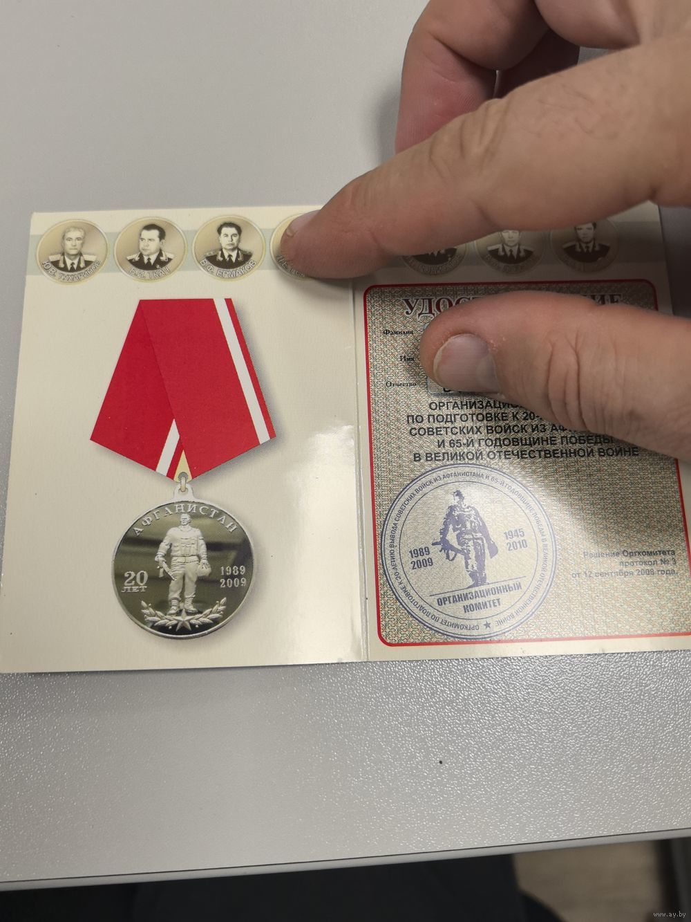 Удостоверение к юбилейной медали. 20 лет вывода Советских войск из Афганистана.