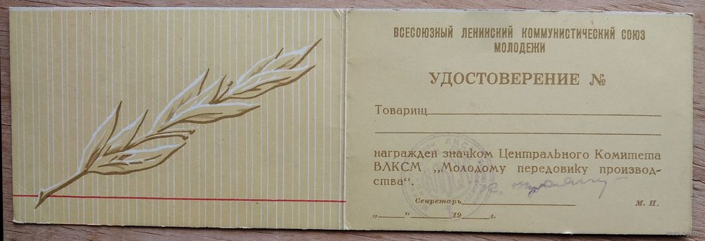 Удостоверение к значку ЦК ВЛКСМ " Молодой передовик производства ". 1970-е. Незаполенное.