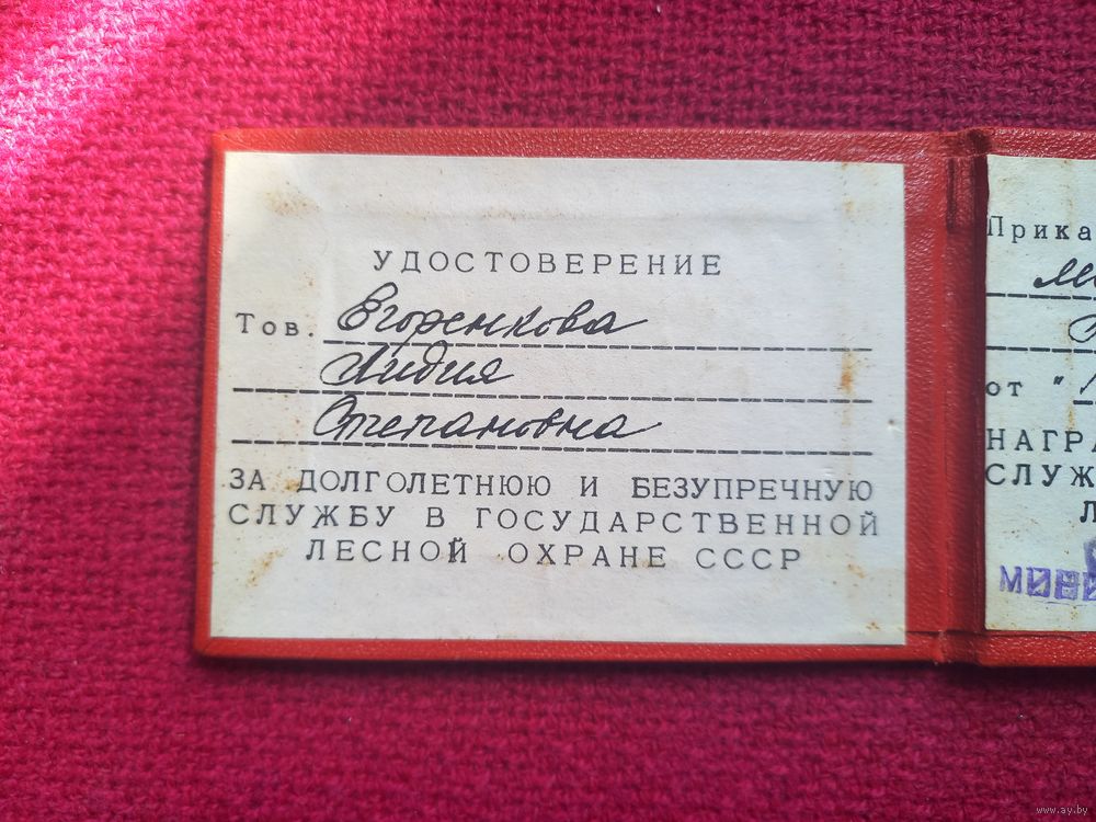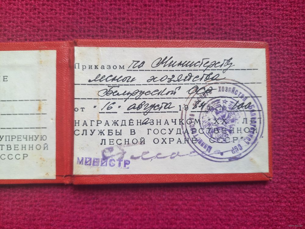 Удостоверение к знаку 20 лет службы в государственной лесной охране 1984 г. БССР.