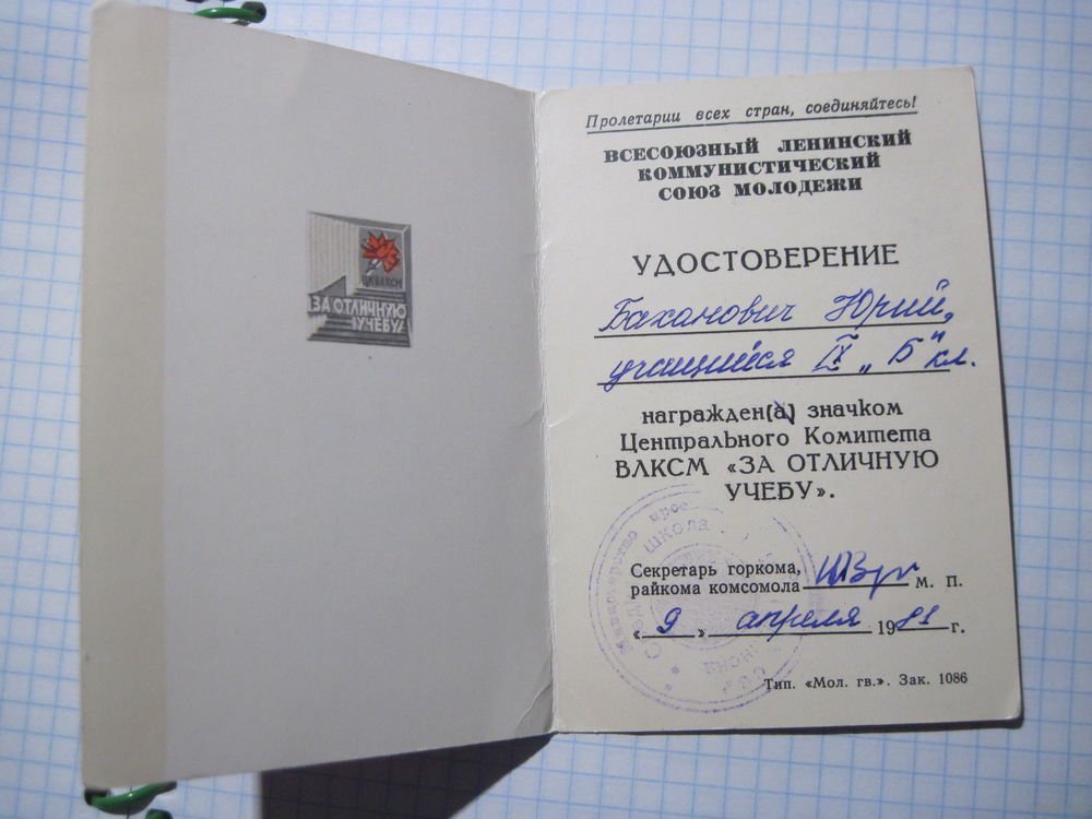 Удостоверение к знаку ЦК ВЛКСМ "За отличную учебу" 1981 г. с рубля!