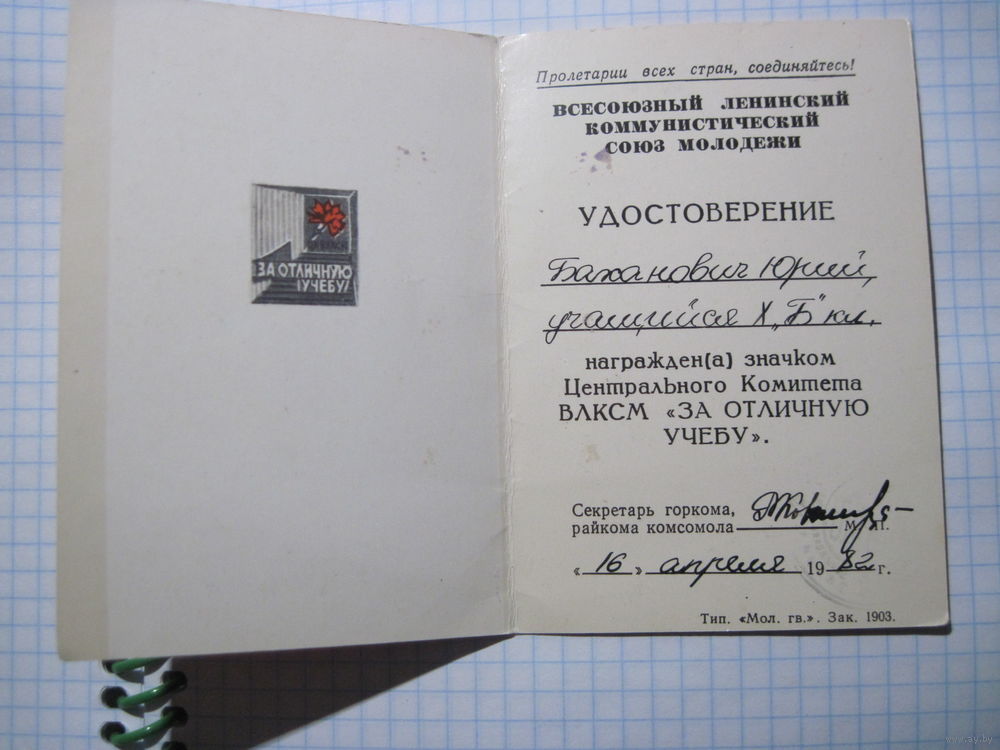Удостоверение к знаку ЦК ВЛКСМ "За отличную учебу" 1982 г. с рубля!