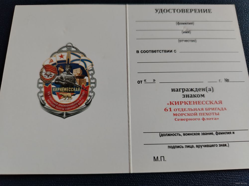 Удостоверение к знаку "Кирвенесская 61 отдельная бригада морской пехоты Северного флота"