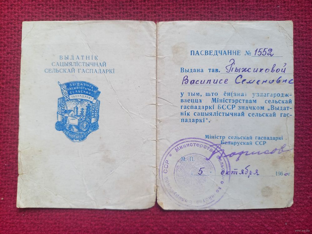 Удостоверение к знаку Отличник сельского хозяйства БССР 1960 г.
