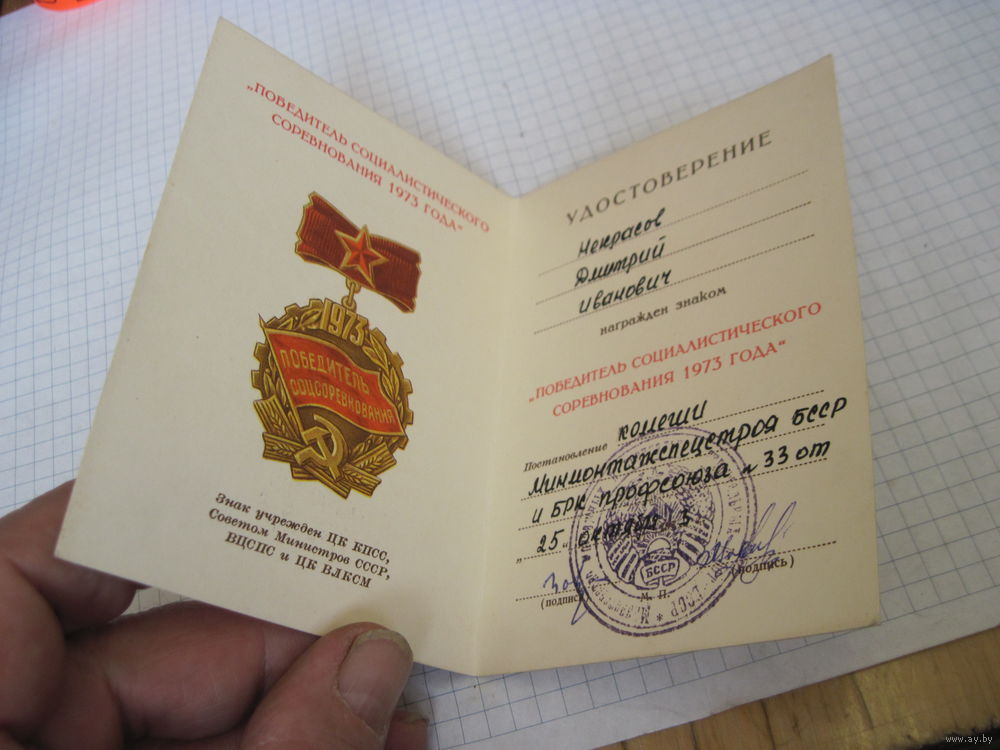 Удостоверение к знаку "Победитель соцсоревнования 1973 г." с рубля!