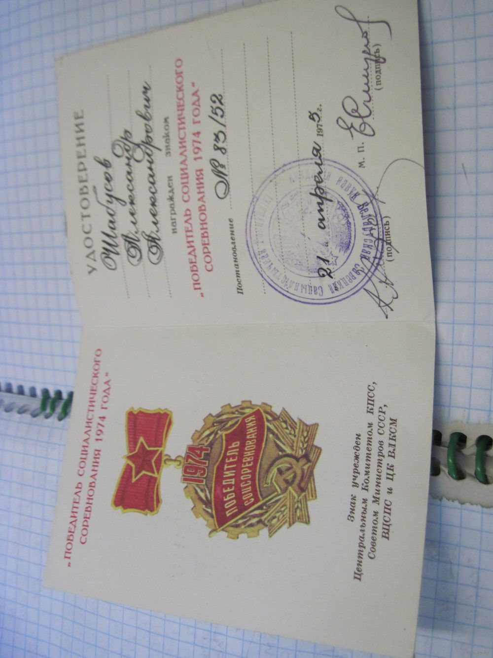 Удостоверение к знаку "Победитель соцсоревнования 1974 г." с рубля!