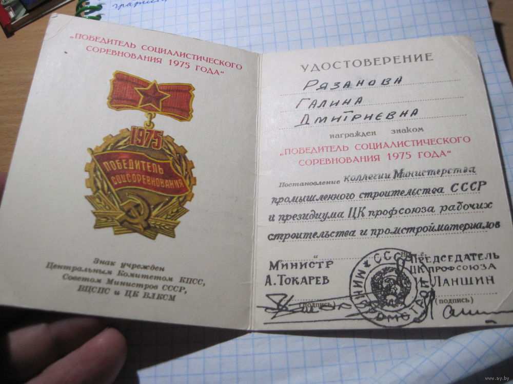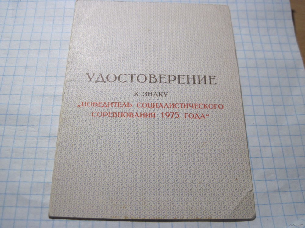 Удостоверение к знаку "Победитель соцсоревнования 1975 г." с рубля!