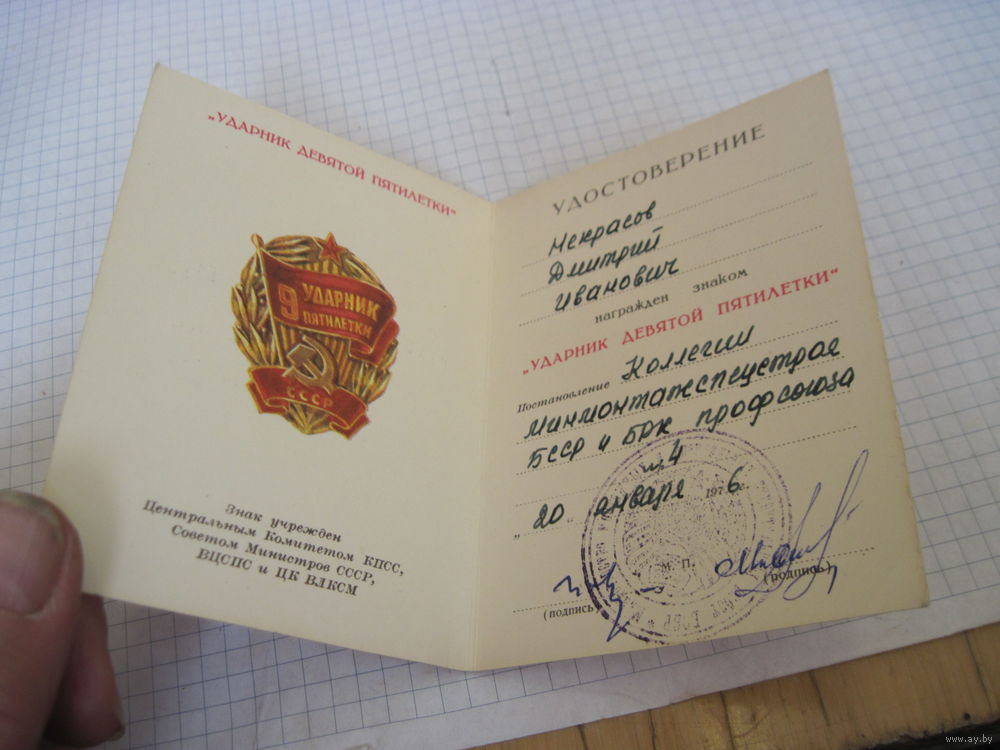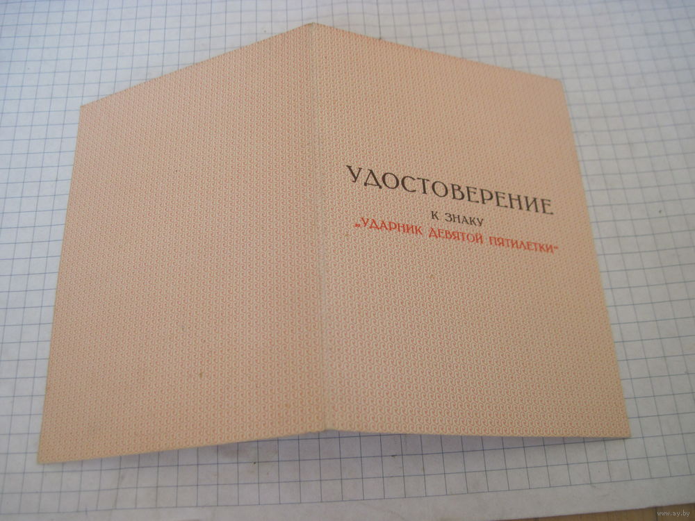 Удостоверение к знаку "Ударник девятой пятилетки" 1976 г. с рубля!